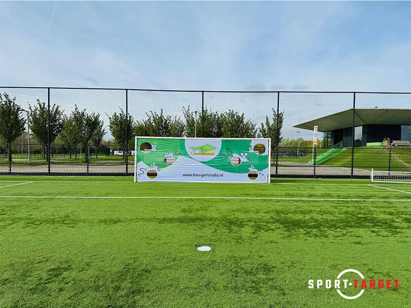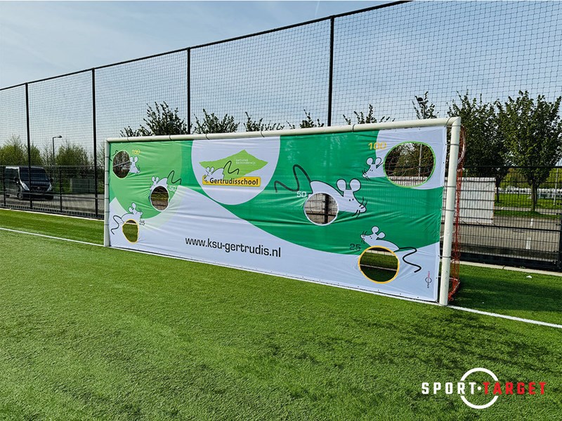 Wat een opwinding om samen te werken met de Gertrudisschool uit Utrecht en hun speelplezier naar een hoger niveau te tillen met onze op maat gemaakte voetbaltarget! Trots presenteren we deze target, met hun unieke logo, dat een leuk detail bevat - een muis die nieuwsgierig uitkijkt naar de doelgaten.