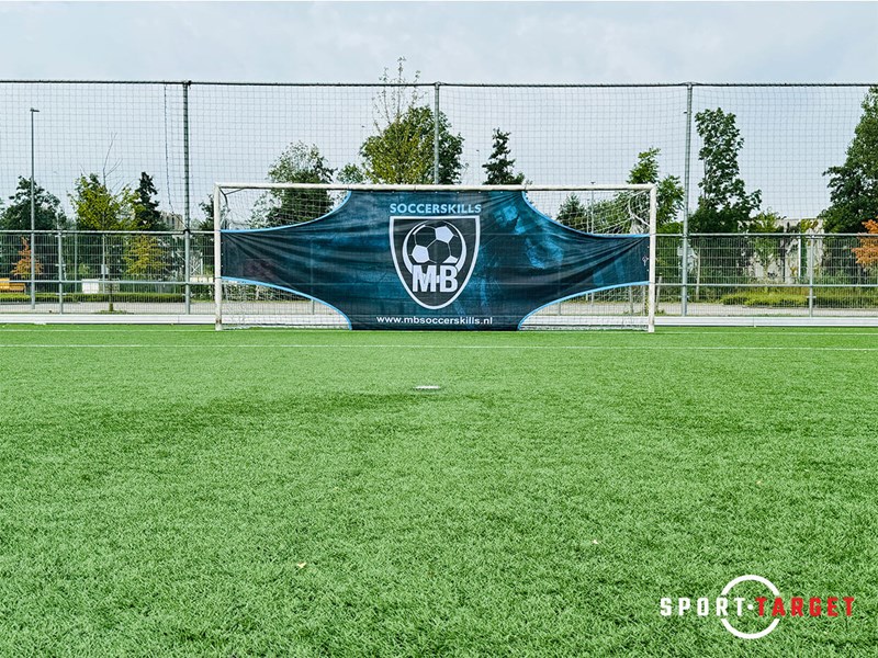 Onze Soccer Train Target custom design wordt standaard geleverd in twee maten. Voor een pupillendoel van 5m x 2m en een senioren doel van 7,32m x 2,44m.